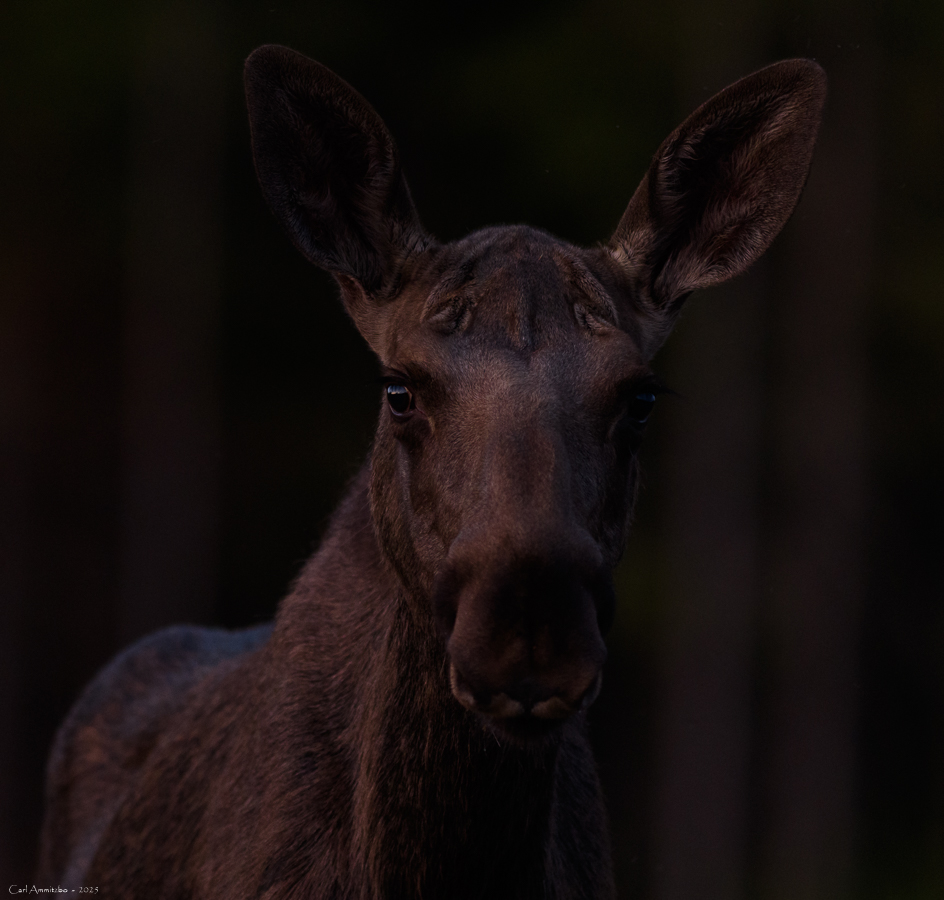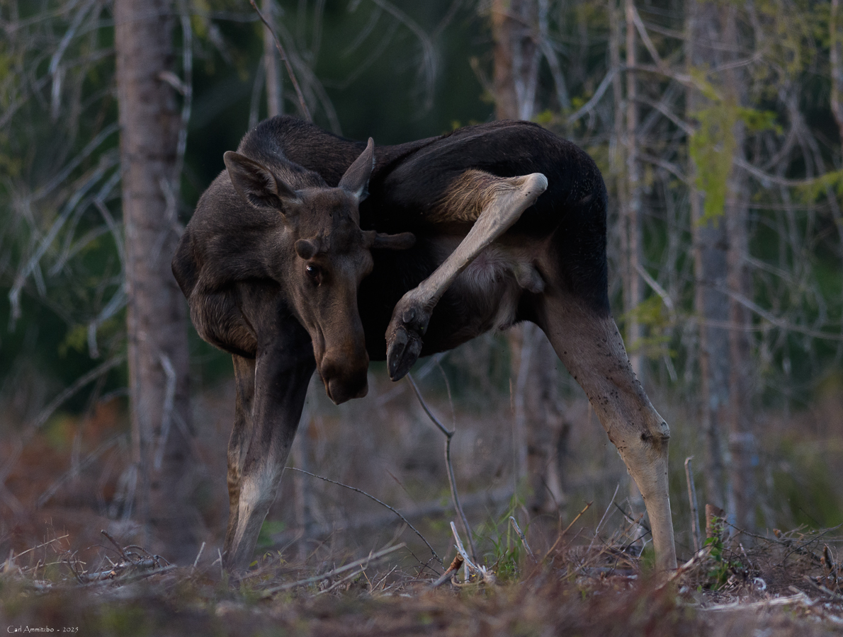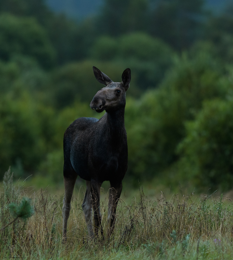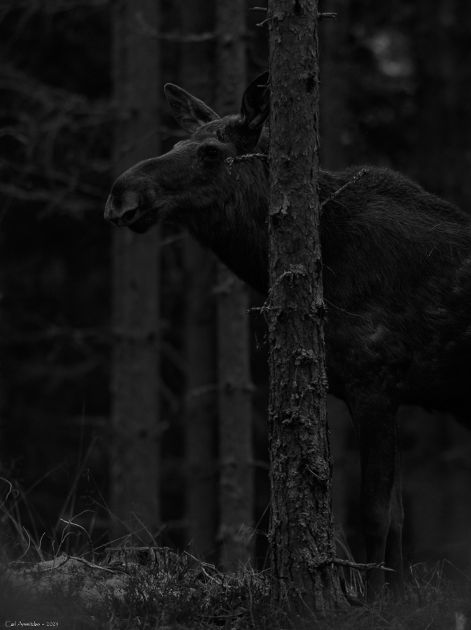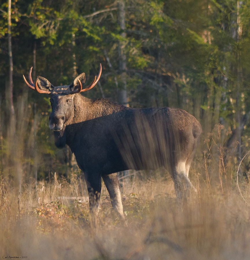I slutningen af september tager jeg op til huset på min årlige elgbrunsttur. I år hører jeg flere elgtyre, der går rundt og lokker. Desværre er det på stor afstand, så i tre af tilfældene ser jeg ikke elgtyren. Jeg ser 10 elge i alt og heraf to små elgtyre. Den ene elgtyr kommer frem på lysningen nedenfor huset. Den er ikke begejstret for lydene fra mit kamera, så det bliver desværre kun til et lille minuts ophold på lysningen og der er ikke meget lys, så jeg må panorere.