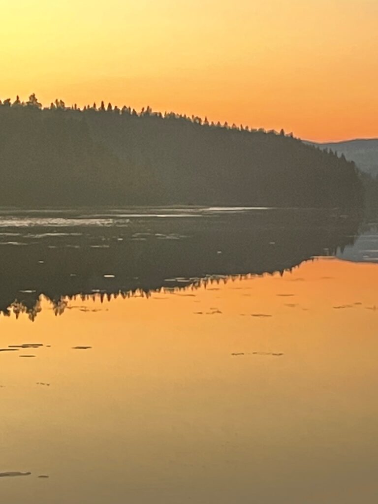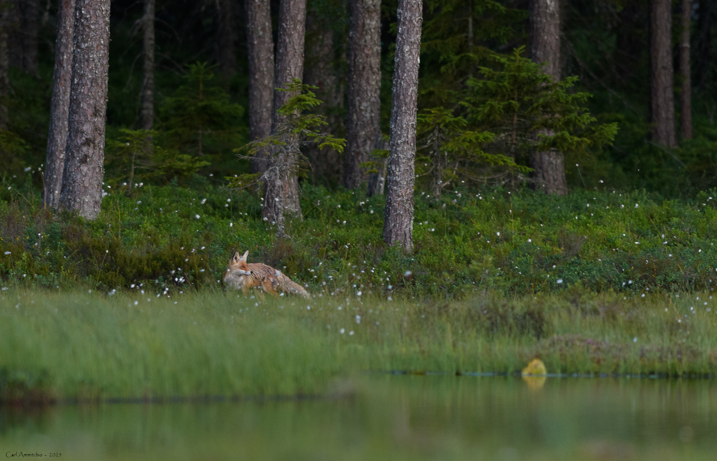 Da solen går ned, er der blevet helt stille, så søens overflade fremstår som et spejl. Der er overaskende få myg og knot, så det er herligt bare at sidde og nyde stilheden. Lige pludselig aner jeg dog en bevægelse ud af øjenkrogen og en flot ræv kommer gående på den modsatte side af søen. Da ræven er nået et stykke hen langs søens bred, så sætter den sig med front imod mig og skriger ud i det begyndende nattemørke. Der er en fantastisk rumklang ved den stille sø, så skriget lyder formidabelt. Ræven skriger flere gange og jeg kan høre svar længere borte fra. Ræven trasker videre og forsvinder ved enden af søen. Jeg får mine første fotos i området af en voksen ræv efter 10 års ihærdige forsøg, så jeg er meget glad.