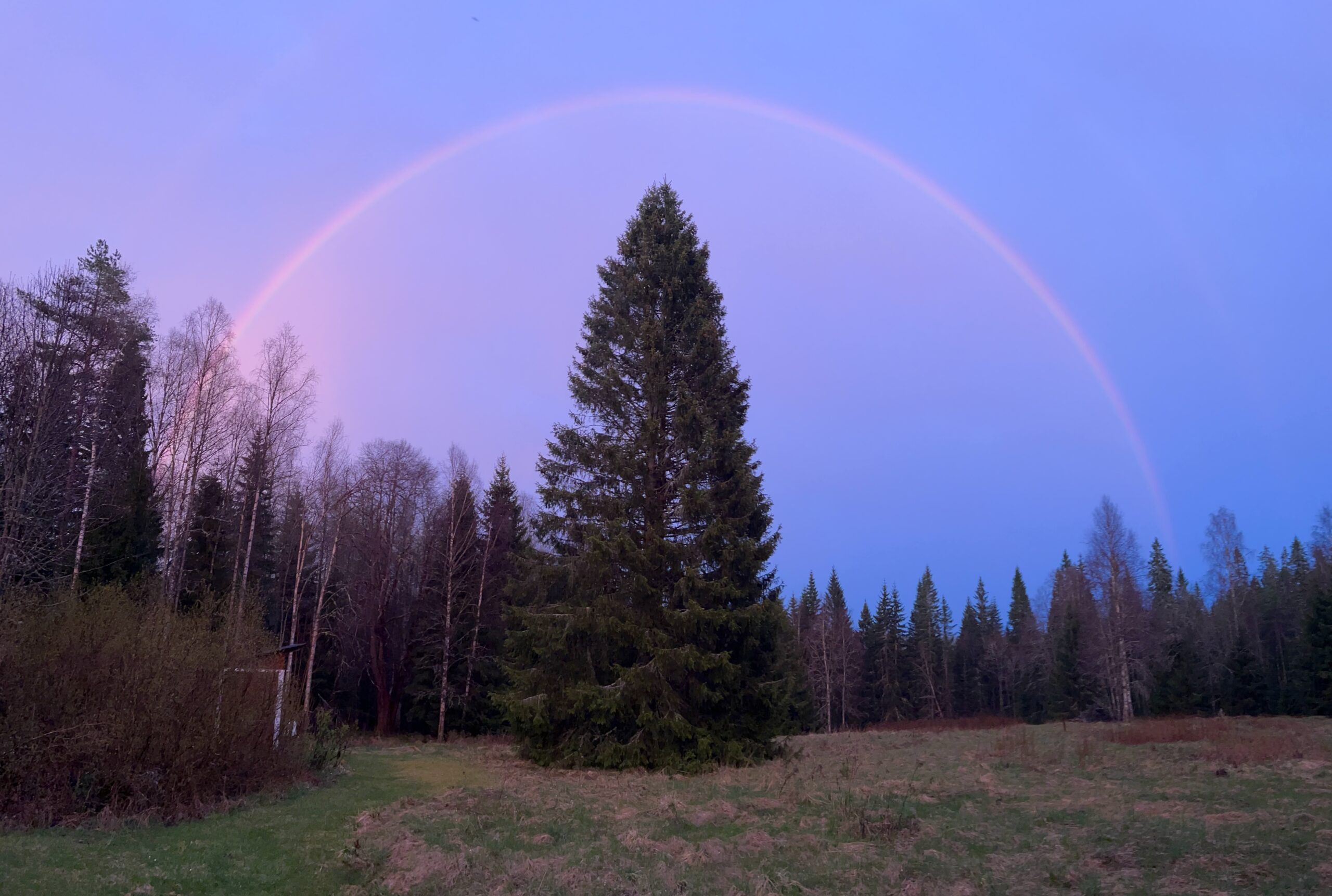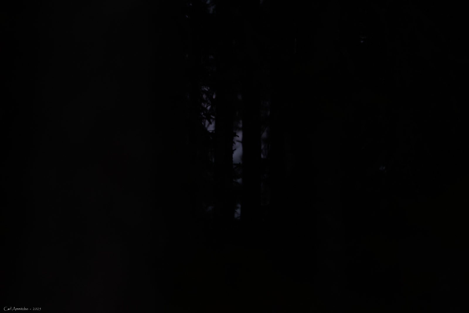 Efter solnedgang sidder jeg udenfor skjulet og kigger mod søen, da jeg lige pludselig hører et prustende dyr bevæge sig gennem skoven. Dyret nærmer sig og det er ikke i nærheden af at bevæge sig lydløst. Jeg drejer lige så stille hovedet og kigger bag mig, mens jeg håber, at der er tale om en elg, der måske vil gå ned til skovsøen. Men der er ikke tale om en elg. Det er en bjørn, der kommer travende igennem skoven. Med ét stopper bjørnen cirka 75 meter fra mig inde imellem nogle nåletræer og det eneste jeg kan se, er en del af dens silhuet mellem træerne mod himlen. Desværre kan jeg ikke flytte kameraet, uden at det kan høres i den meget stille aften, så jeg bliver siddende i den ubehagelige stilling med hovedet nærmest drejet af led for at se mod bjørnen. Efter et kort stykke tid forsvinder silhuetten mellem træerne fuldstændigt og det aldeles lydløst, hvilket er meget imponerende. Pyha – det var ved at blive lidt for spændende. Jeg tager et billede af det sted, hvor bjørnen stod og kan slappe af igen. Jeg gætter på, at bjørnen stoppede sin travetur, da den fik færten af mig og ikke følte sig truet, men mennesker ved bjørnen sikkert godt, at den skal holde sig fra.
