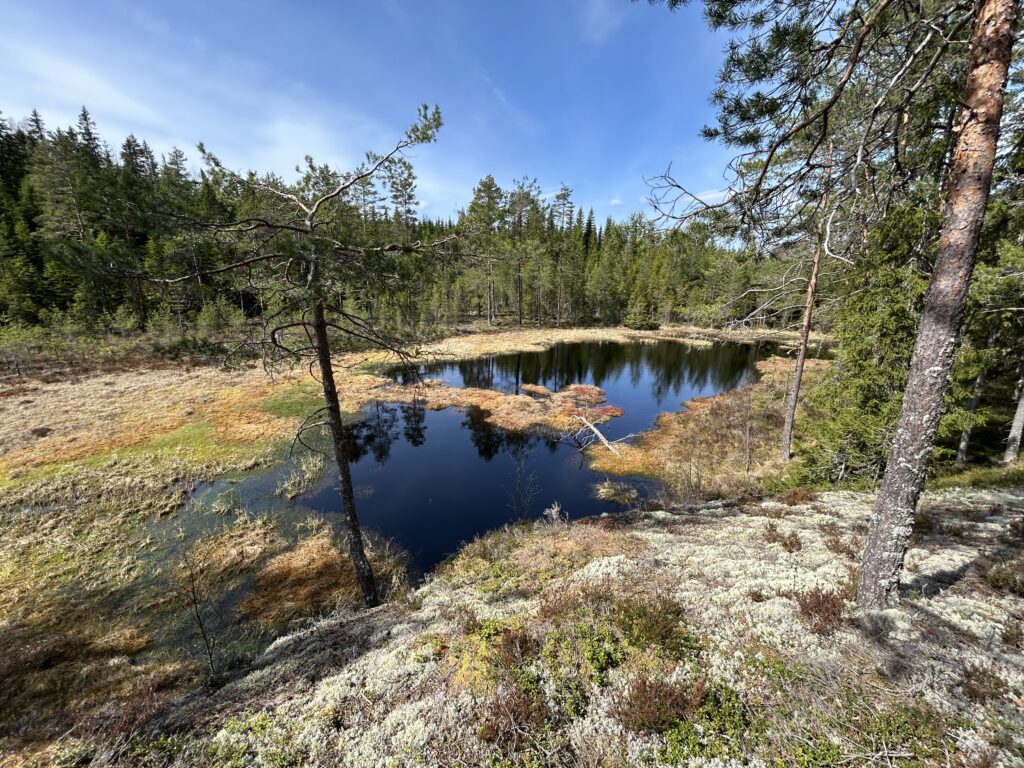 Der er allerede mange modne blåbær og enkelte modne multebær Jeg ser nogle elge, men ellers er der påfaldende stille og jeg ser ikke engang nogle rødstrubede lom ved de søer, som jeg opsøger.