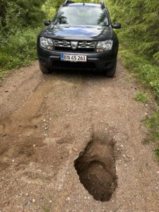 Jeg opsøger den lille elv, hvor jeg så bæveren sidst og denne gang har jeg kameraudstyr med. Der er kommet et stort hul i grusvejen men med lidt forsigtighed kommer jeg forbi.