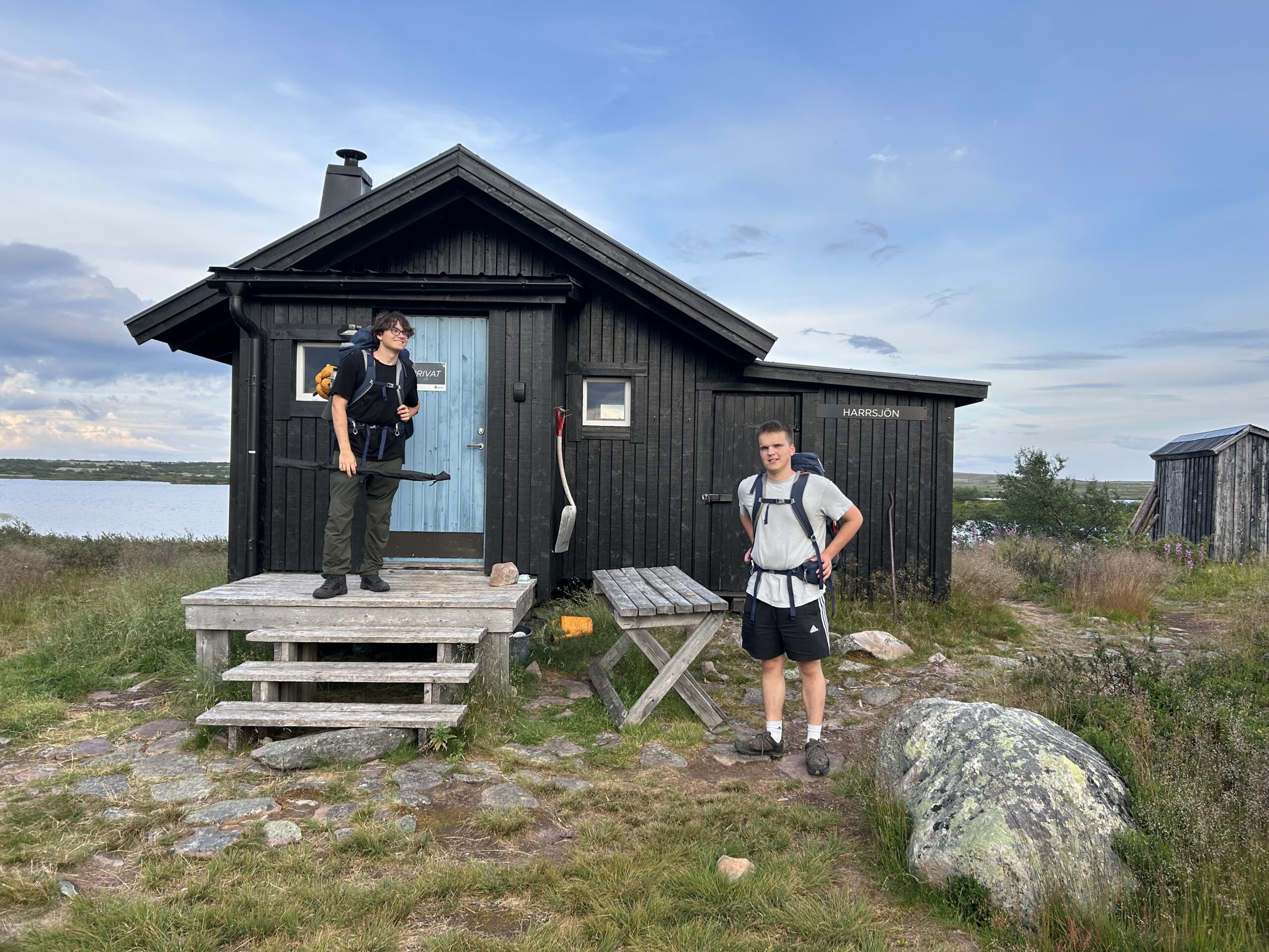 Da det begynder at blive mørkt og vi er kommet op over trægrænsen, har vi stadigvæk mere end 3 km hen til vores hytte. Vinden er taget til og vi er gennemblødte og trætte. Heldigvis støder vi på en rastehytte, hvor vi kryber i ly. Her kan vi få alt det våde tøj af, tænde op i brændeovnen og få tørret alt vores tøj og udstyr. Vi overnatter i hytten på nogle meget smalle bænke, men det fungerer fint og humøret er godt.