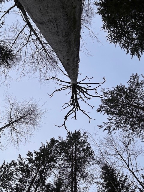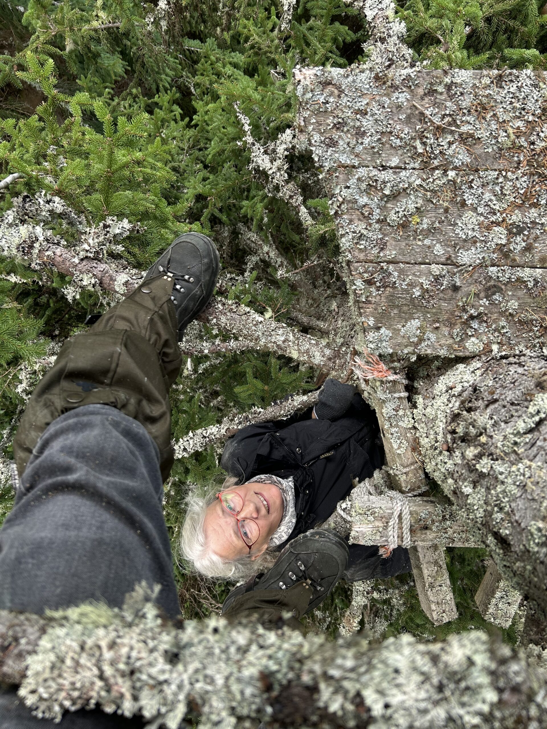Selv om Bente er forkølet, klatrer vi op i et grantræ til en udsigtsplatform, som hendes søn, Simon har været med til at lave for mange år siden.