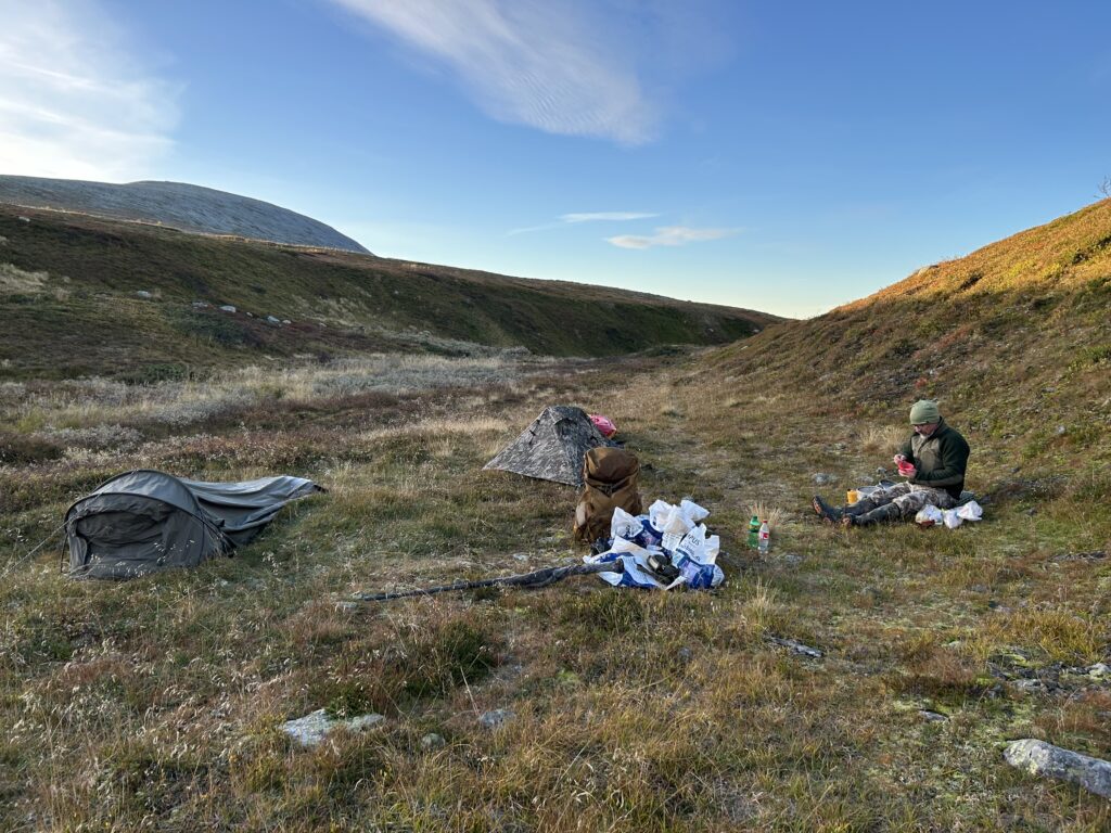 I slutningen af mit ophold kører jeg videre nordpå, hvor jeg endnu en gang skal på en guidet tur med WildSweden. Denne gang en tur i Sonfjället for at kigge efter bjørne. Det er begyndelsen af oktober, så fjeldet kan have udfordrende vejr og hver deltager skal selv bære alt, hvad vedkommende skal bruge under de 2 døgns ophold i fjeldet. Det bliver en glimrende tur. Strategien er at opsøge toppe over trægrænsen og derfra kigge ned i skovbunden efter bjørne i deres søgning efter blåbær. På denne tid af året spiser bjørnene mange blåbær for at blive tilpas fede, før de går i vinterhi.