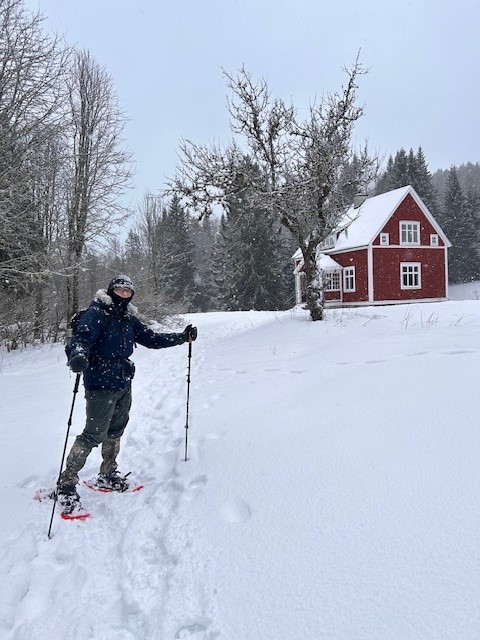 Vi parkerer bilen ved naboen og det viser sig, at det er bedst at komme frem til huset i snesko. Som sædvanligt om vinteren bor vi i køkkenet.