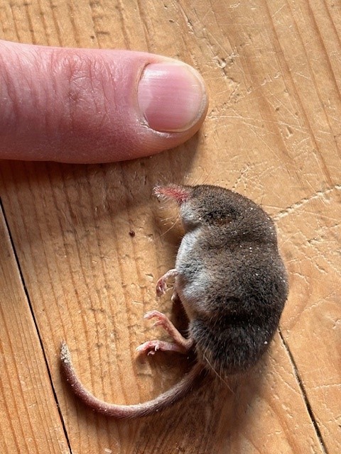 Vi finder en usædvanlig lille spidsmus i en tom natpotte. Måske en unge eller en dværgspidsmus.